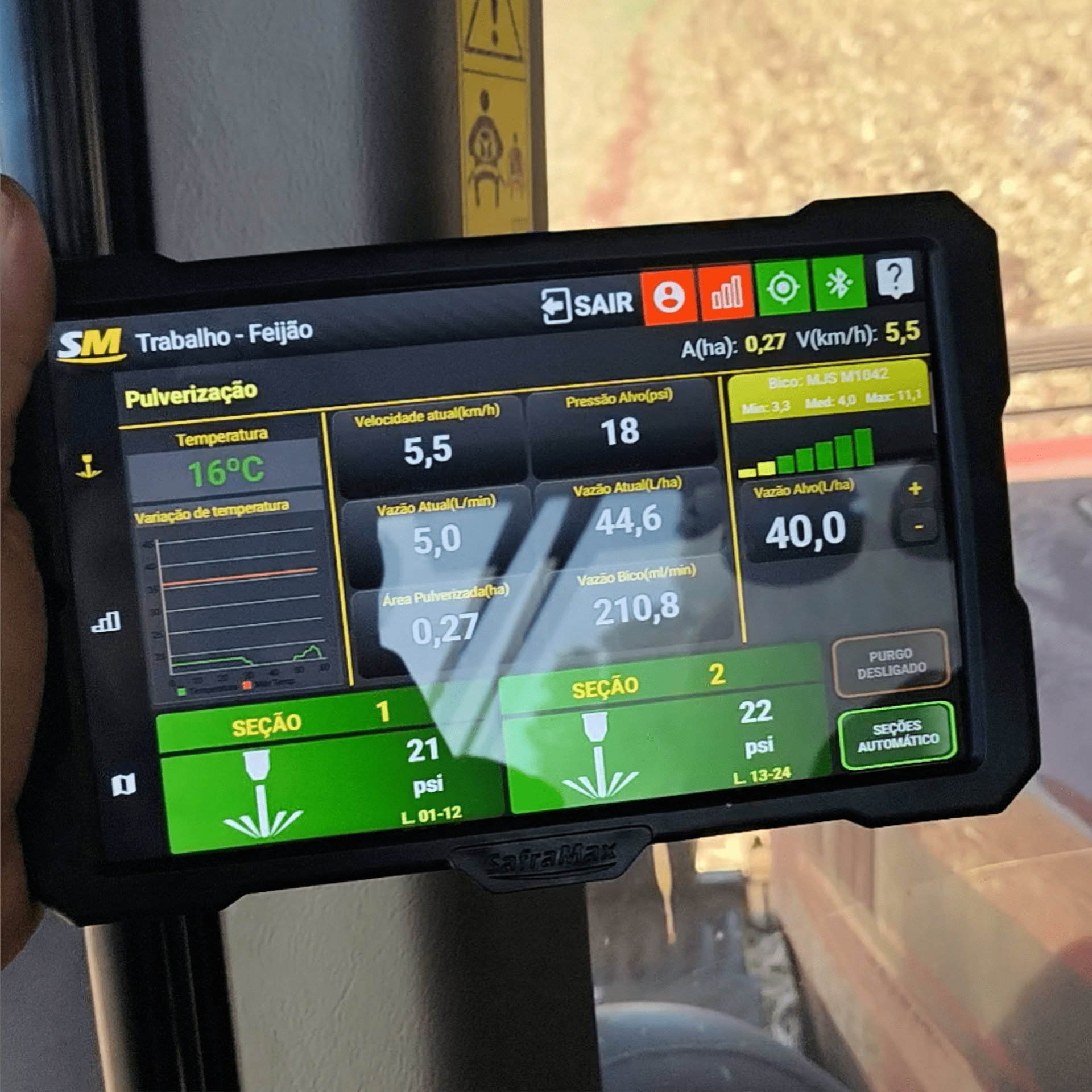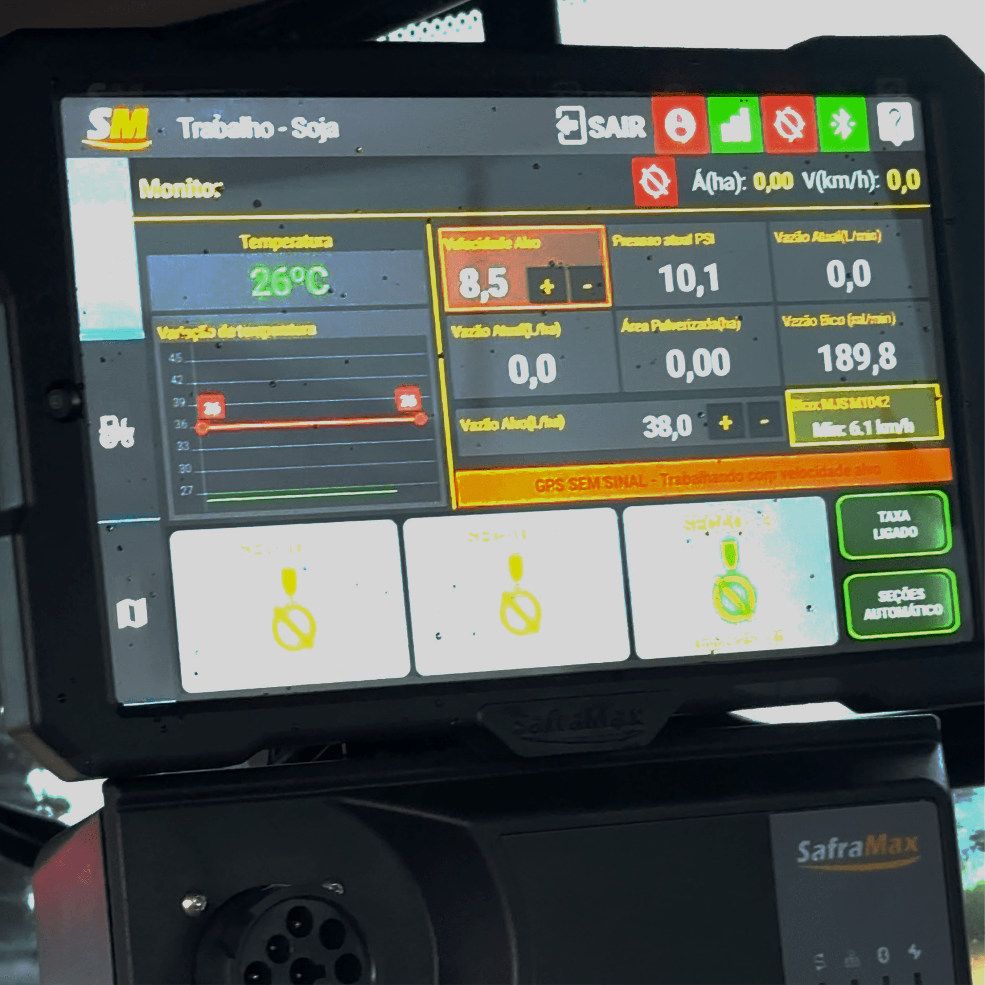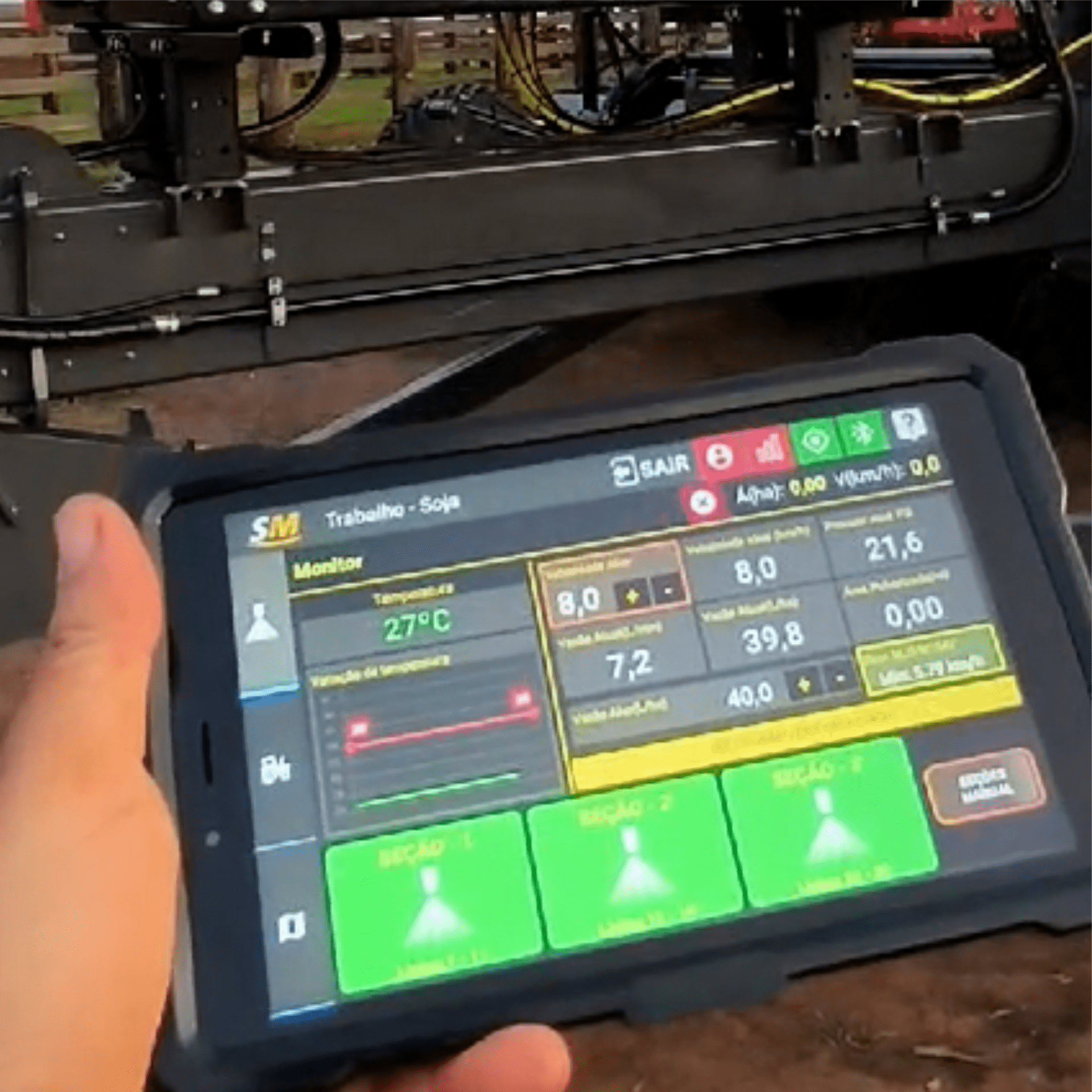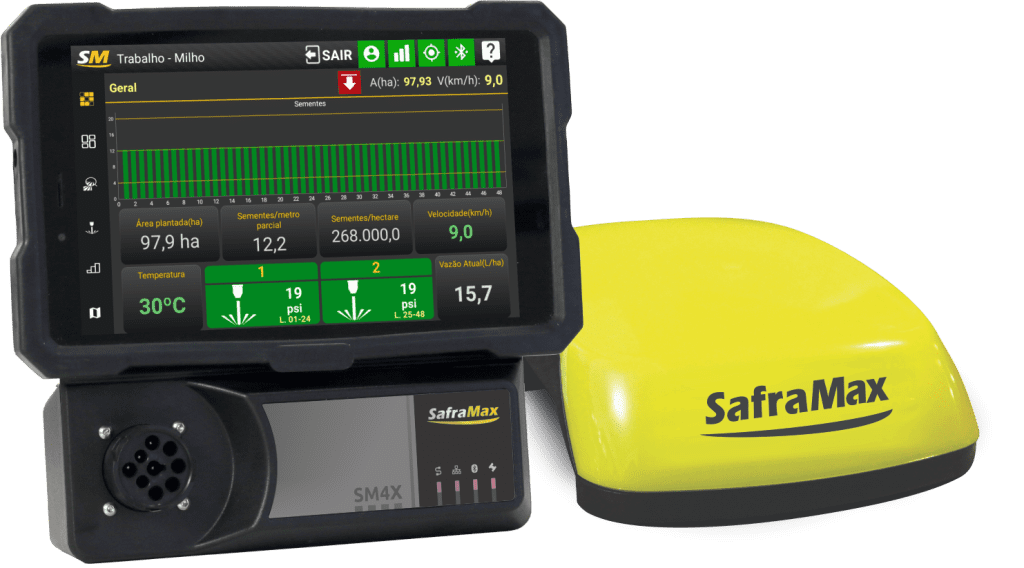 CENTRAIS DE PLANTIO SM4X Central de plantio SM4X Características:Monitoramento de fluxo de sementes;Informações de linhas conectadas;Compatível com FieldView (necessita do módulo smartView);Horas trabalhadas;Contagem de sementes (por linha e total);Comparativo entre linhas (caída de semente).Sementes por metro (área plantada);Hectarímetro (parcial e total);Odômetro (distância linear percorrida);Velocímetro (monitora a velocidade do plantio);Antena GPS Smart;Controle de pulverizadores de sulco Safrajet;Controle automático de taxa de aplicação no sulco;Registro detalhado de ocorrências;Mapas, relatórios e gráficos na web;Histórico dos plantios na nuvem;Telemetria (via 3G/4G);Monitoramento digital de temperatura;Monitoramento digital de nível baixo;Monitoramento digital de pressão. Galeria de imagens