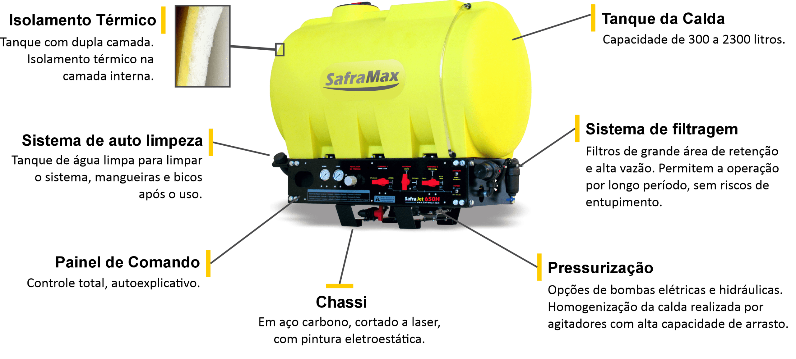 • Controle e acionamento automático de até 3 seções (exceto Safrajet Maestro – até 2 seções).