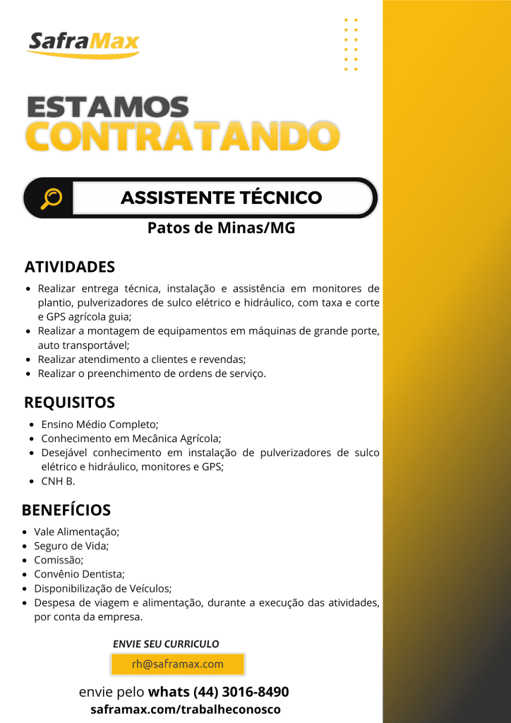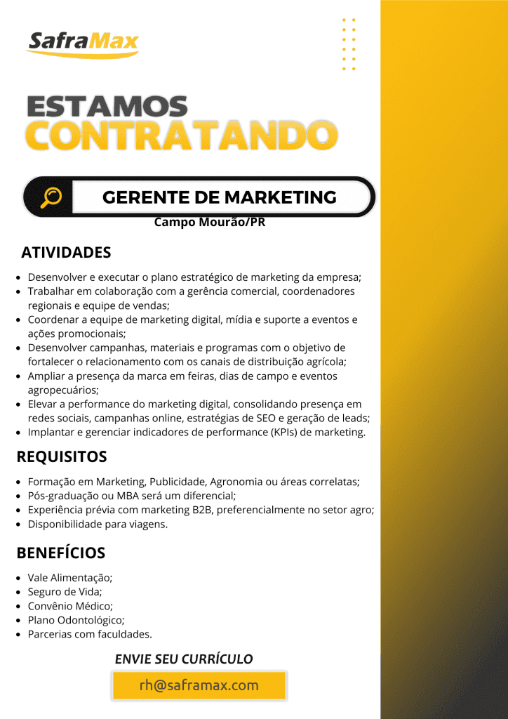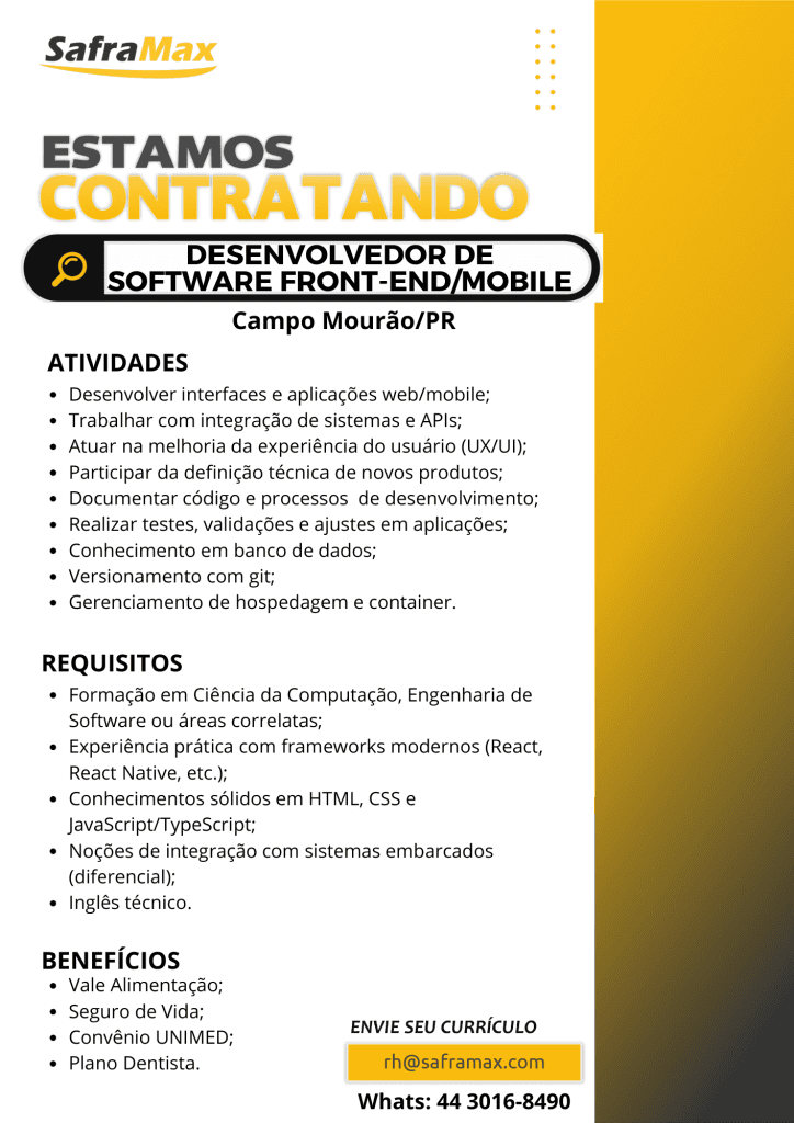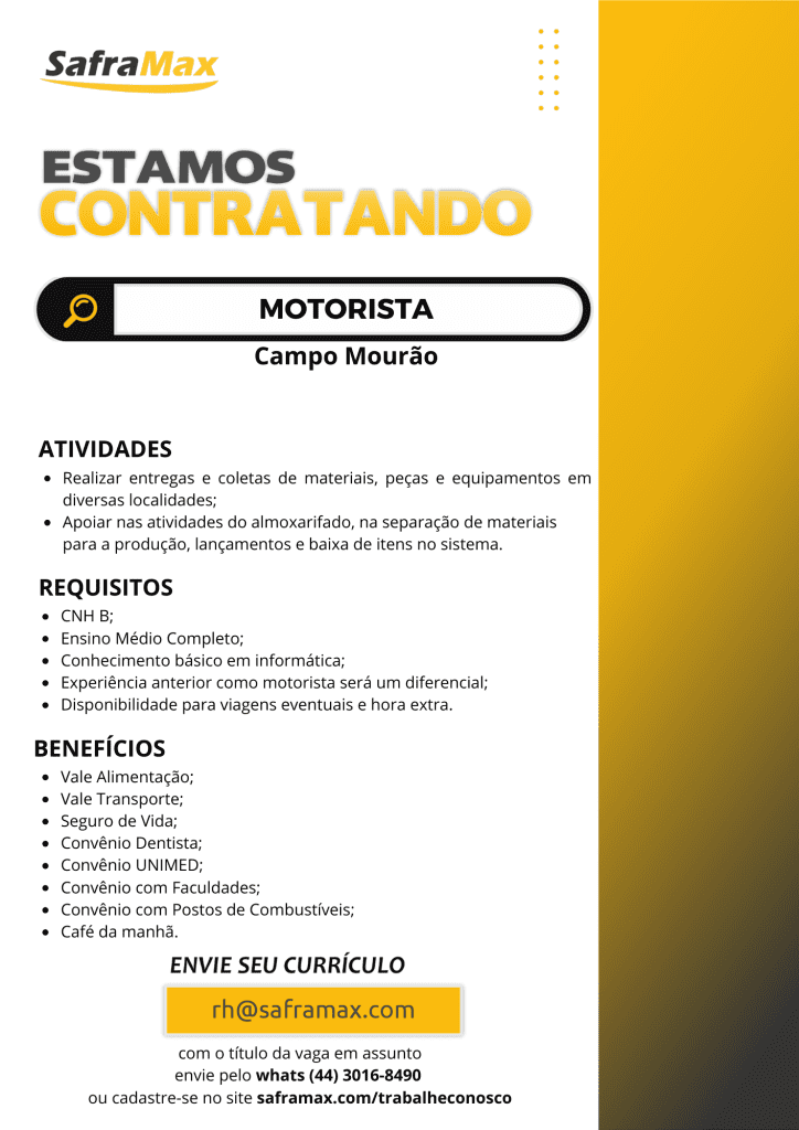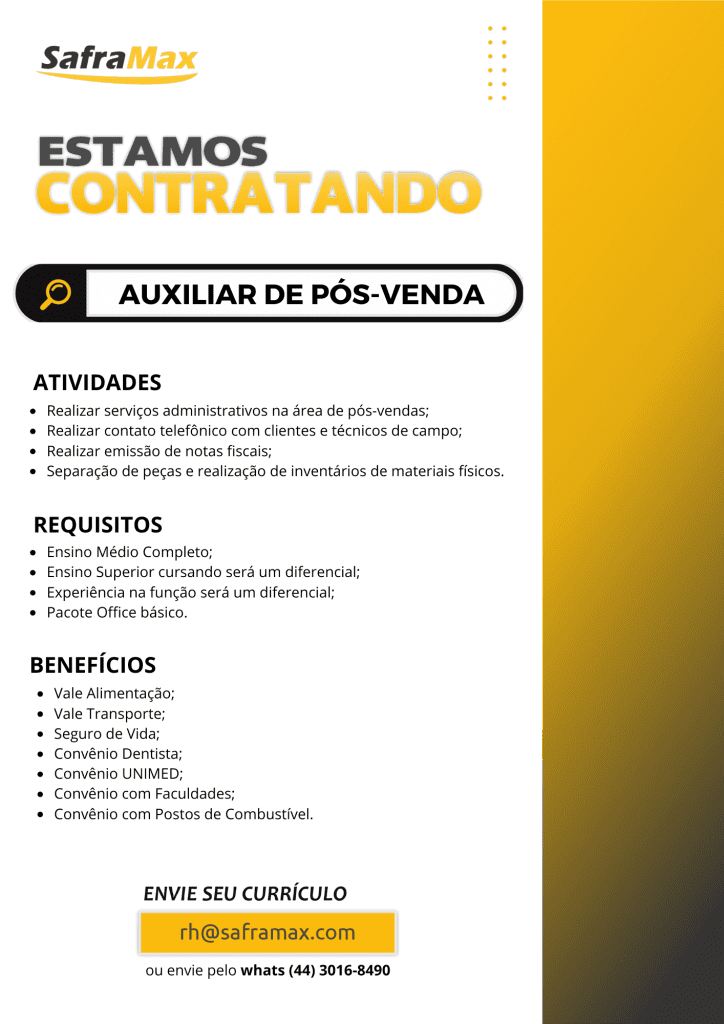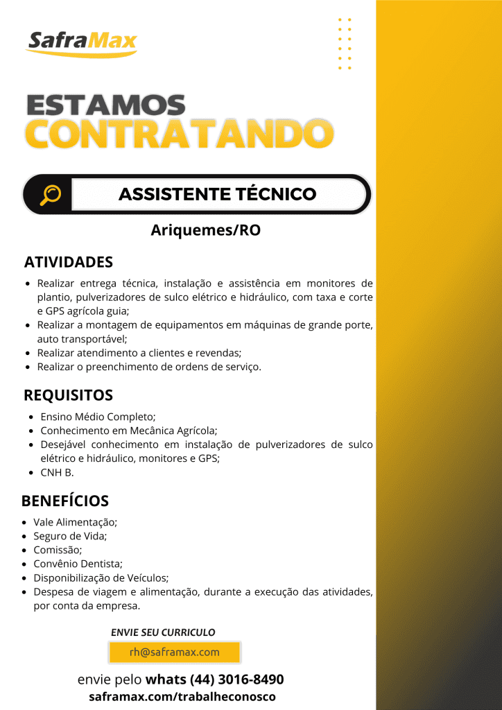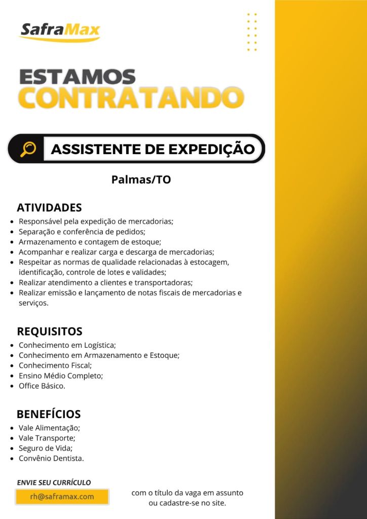 Você busca um desafio empolgante em sua carreira? A Saframax está procurando por talentos como você! Junte-se a nós e faça parte de uma equipe inovadora e apaixonada. Se você está pronto para se destacar e contribuir para o crescimento de uma empresa em constante evolução, candidate-se hoje mesmo e descubra as infinitas possibilidades que aguardam por você na Saframax. Venha fazer a diferença conosco!